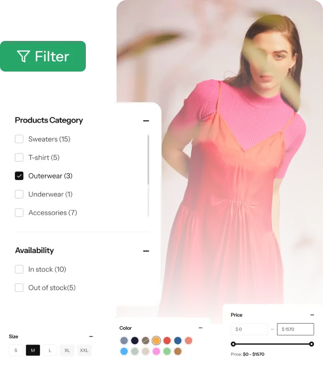 Filter nach Preis, Farbe, Größe oder Kategorie passieren in Echtzeit.